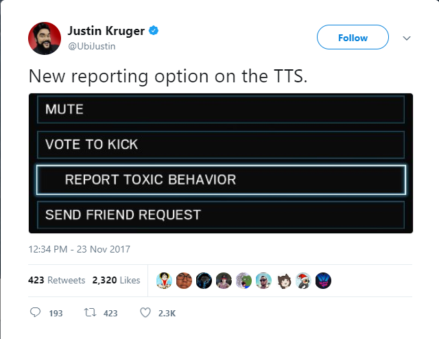 ซึ่งทาง Ubisoft กำลังทดลองระบบนี้ภายในเกม Rainbow Six Siege ในหัวข้อ "Toxic Behavior" หรือพฤติกรรมไม่เหมาะสมนั่นเอง โดยเจ้าหัวข้อรีพอร์ทนี้ได้อยู่ในเกมแล้วแต่เป็นบนระบบเซิร์ฟเวอร์ทดสอบตัวเกมเท่านั้น ซึ่งทาง Ubisoft บอกว่าต้องทดสอบกันก่อน และการที่ผู้เล่นที่ถูกรายงานมานั้นจะถูกแบน ก็ต้องแน่ใจด้วยว่าผู้เล่นคนนั้นมีพฤติกรรมไม่ดีอย่างที่โดนรีพอร์ทมาจริงๆแต่เอาจริงๆแล้ว เราก็ยังไม่แน่ใจกันอยู่ดีว่า "พฤติกรรมไม่เหมาะสม" นั้น ความหมายแบบเป็นรูปเป็นร่างของมันคืออะไร อาจจะหมายถึงการกล่าววาจาที่หยาบคาย การเลือกปฏิบัติกับผู้เล่นต่างๆ หรือแม้กระทั่งการสแปมแชท ซึ่งหลังจากที่ Justin Kruger หนึ่งในทีมผู้พัฒนาได้ทวีตเตอร์ข่าวนี้ลงไปในทวีตเตอร์ของเขา ก็มีผู้เล่นเสนอเข้ามาว่า Team Killing ก็อาจจะเป็นพฤติกรรมที่ไม่เหมาะสมด้วยเช่นกัน (หมายถึงการยิงฆ่าหรือก่อกวนสมาชิกทีมด้วยกันเอง) ซึ่งปัญหานี้เป็นสิ่งที่ทาง Ubisoft พยายามหาแก้มาโดยตลอดในช่วงระยะหลังนี้ และล่าสุดมีข่าวว่าอาจจะนำระบบ Friendly Fire ออกในโหมดเกม Casual ด้วยครับ และ Justin ยังบอกอีกว่า สำหรับระบบรีพอร์ทตัวนี้น่าจะใช้การได้เร็วๆนี้สำหรับ Rainbow Six Siege ตอนนี้ก็กำลังลดราคาอยู่ในเทศกาล Steam Autumn Sale 2017 เช่นกันครับ