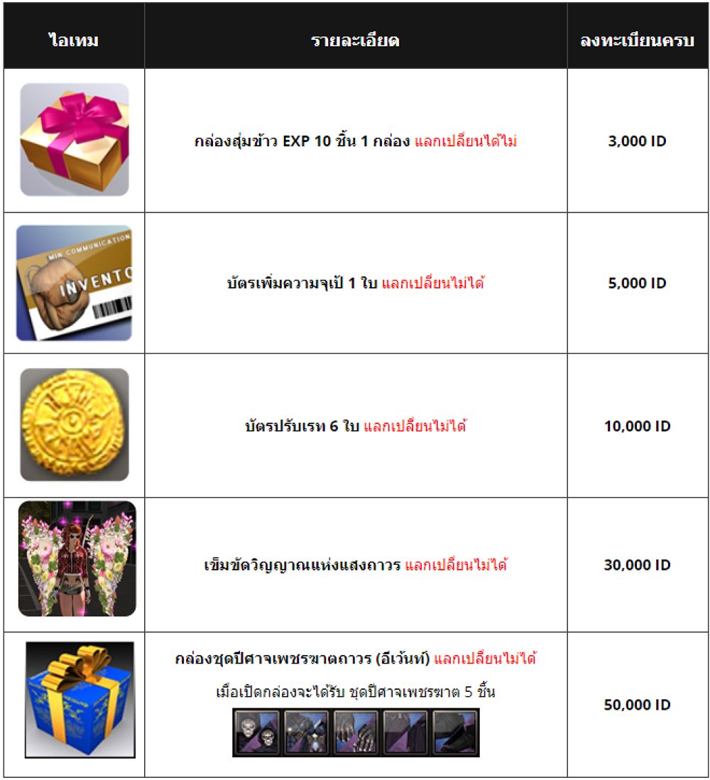- ระบบจะส่งไอเทมให้ที่ตู้ไปรษณีย์ หากรับไอเทมออกมาแล้ว จะแลกเปลี่ยนไม่ได้ รวมถึงไม่สามารถนำไอเทมไปฝากล็อคเกอร์ส่วนตัวได้ (แนะนำให้ใช้ตัวละครที่ต้องการเล่นในการรับไอเทมออกจากตู้จดหมาย)