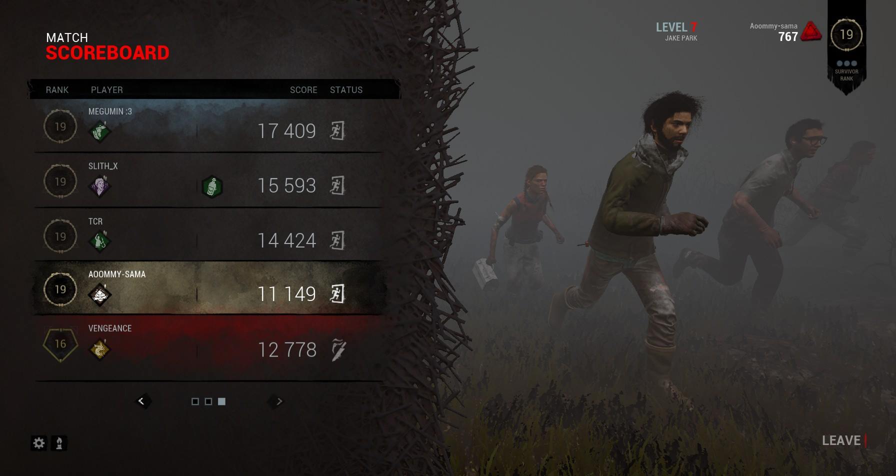 เมื่อจบเกมจะมีตารางคะแนนมาให้เราได้ดู ซึ่งนับจากการกระทำของเราไม่ว่าจะเป็นการซ่อมเครื่อง Generater หรือการแขวนเซอร์ไวเวอร์ู หากคุณเล่นใน Rank Game คุณจำเป็นจะต้องทำคะแนนให้ได้ 7,000 ขึ้นไป เพื่อไม่ให้ตกจาก Rank ปัจจุบันและ 10,000 คะแนน เพื่อเป็นการอัพ Rank ในขั้นต่อไป คะแนนที่ได้หลังจากจบเกมจะสามารถนำไปอัพเลเวลของตัวละครที่เราเล่นเพื่อปลดล็อค Perks, Offerings และ Add-ons ระดับ Rank จะเริ่มต้นจาก 20 และไต่ขึ้นไปจนถึง Rank 1 แต่การไต่ Rank นั้น ไม่ว่าจะเกมไหนมันก็ต้องแลกมาด้วยความหัวร้อน เหมือนกับสิ่งที่เราต้องสังเวยให้กับซาตานนั้นแหละค่ะ ซึ่งดิฉันเชื่อว่า 99% ของผู้เล่นเกมนี้ จะต้องผ่านการหัวร้อนมาแล้วอย่างแน่นอน!