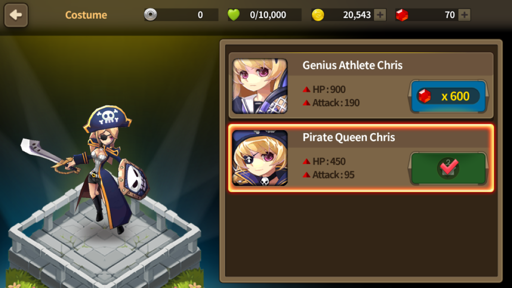 ภายในเกมหากเราเบื่อชุดเดิมๆล่ะก็สามารถใช้ Gem เพื่อซื้อ Costume สวยๆใส่เพิ่มได้นอกจากสวยแล้วยังเพิ่มค่าสเตตัสให้กับเราด้วย ที่พิเศษคือหากเราเข้าเล่นช่วงนี้จะได้รับ Pirate Queen Chris ซึ่งเป็นชุดพิเศษต้อนรับการเปิดเกมครับ