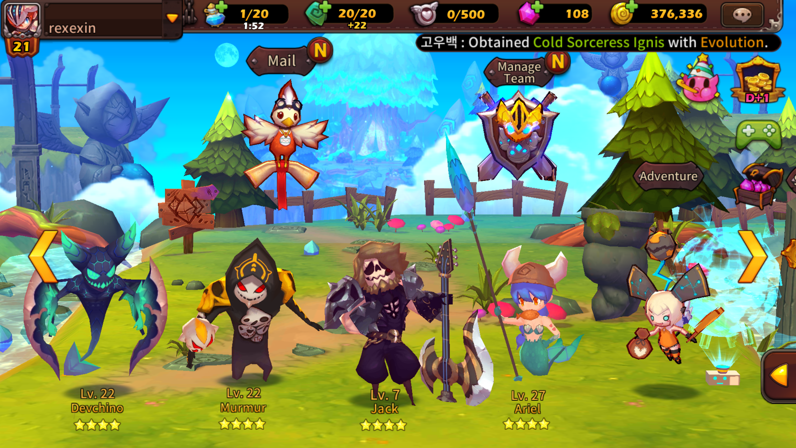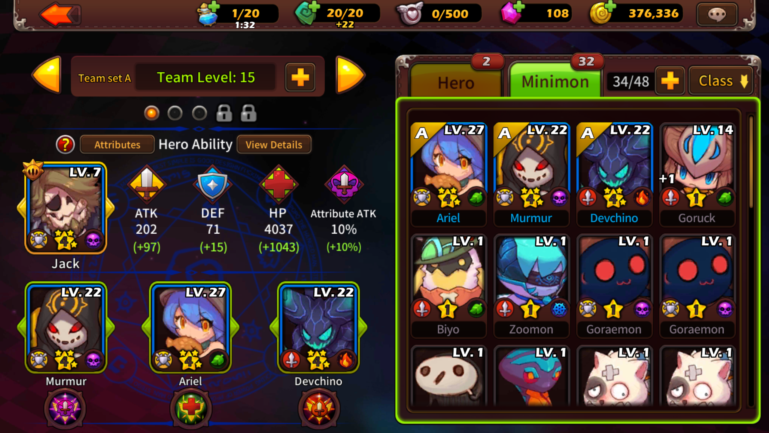 ภายในเกมนี้มอนเสอตร์ต่างๆเราจะแบ่งออกเป็น Minimon และ Heroes โดย Minimon (ต่อไปขอเรียกว่ามอน)นั้นสามารถที่จะ Evo จนพัฒนาเป็นฮีโร่ได้ โดยในฉากนั้นเราจะต่้องเลือกฮีโร่ 1 ตัวและมินิม่อนอีก 3 ตัวไปเป็นเพื่อนในการลุยซึ่งภายในเกมนี้มีโบนัสเล็กน้อยคือหากเราเลี้ยงมอนเสอตร์ตัวไหนให้ถึงเลเวล 30 ได้แล้วล่ะก็เราจะได้เพชรฟรี 5 ชิ้นเป็นการตอบแทน(เฉพาะครั้งแรกนะ)