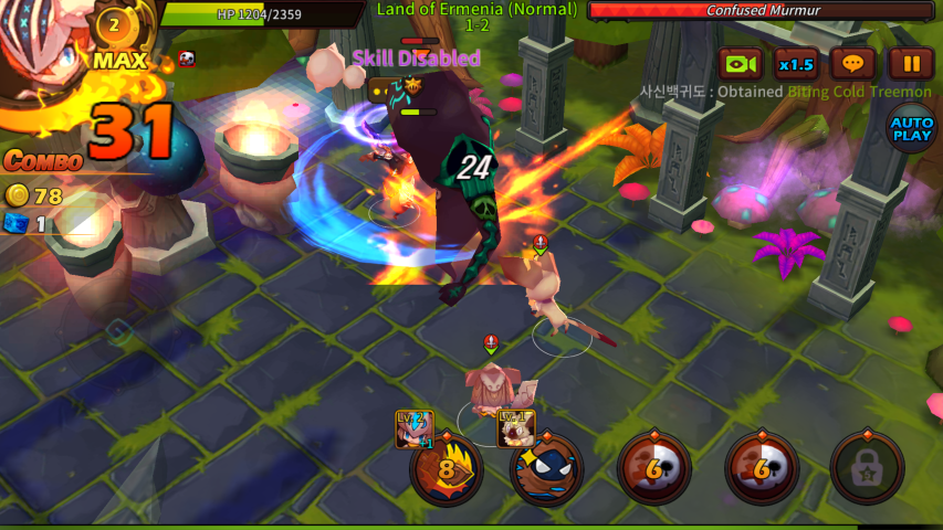 ในส่วนของการต่อสู้เราจะสามารถควบคุมตัวละครได้อย่างอิสระหรือจะให้ Ai คอยควบคุมแล้วเราทำแค่กดสกิลก็ทำได้โดยในปลายของด่านต่างๆก็จะมีบอสอยู่เมื่ออำจัดได้เราก็จะได้รังรางวัล