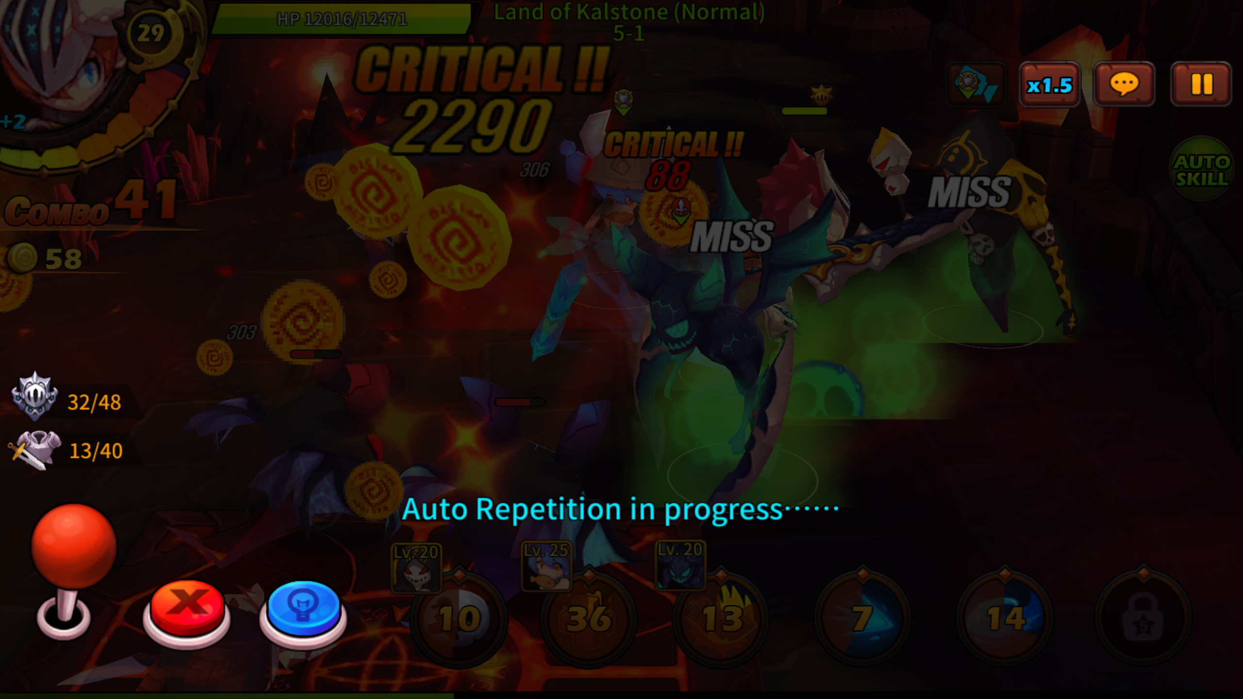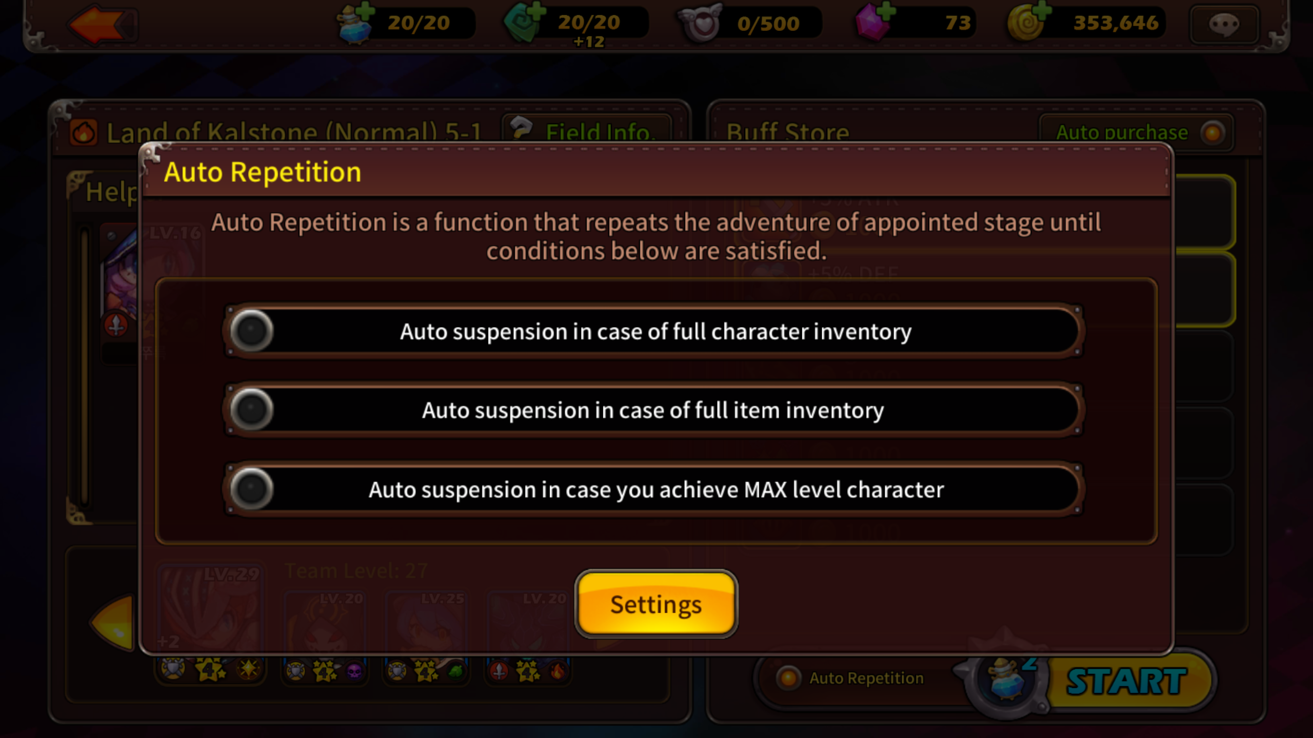 เมื่อเราเลเวลถึง 20 เกมจะมีโหมดเล่นอัตโนมัติ โดยจะเล่นด่านเดิมไปเรื่อยๆจนกว่าเราจะสั่งหยุดหรือครบตามเงื่อนไขที่เราติ๊กไว้แถมที่สำคัญในโหมดนี้หน้าจอจะปรับมืดไว้ทำให้ไม่เปลืองแบทอีกด้วย (จะมีให้เลือกก่อนเข้าดันเจี้ยนโดยการติ๊กที่ Auto Repetition)