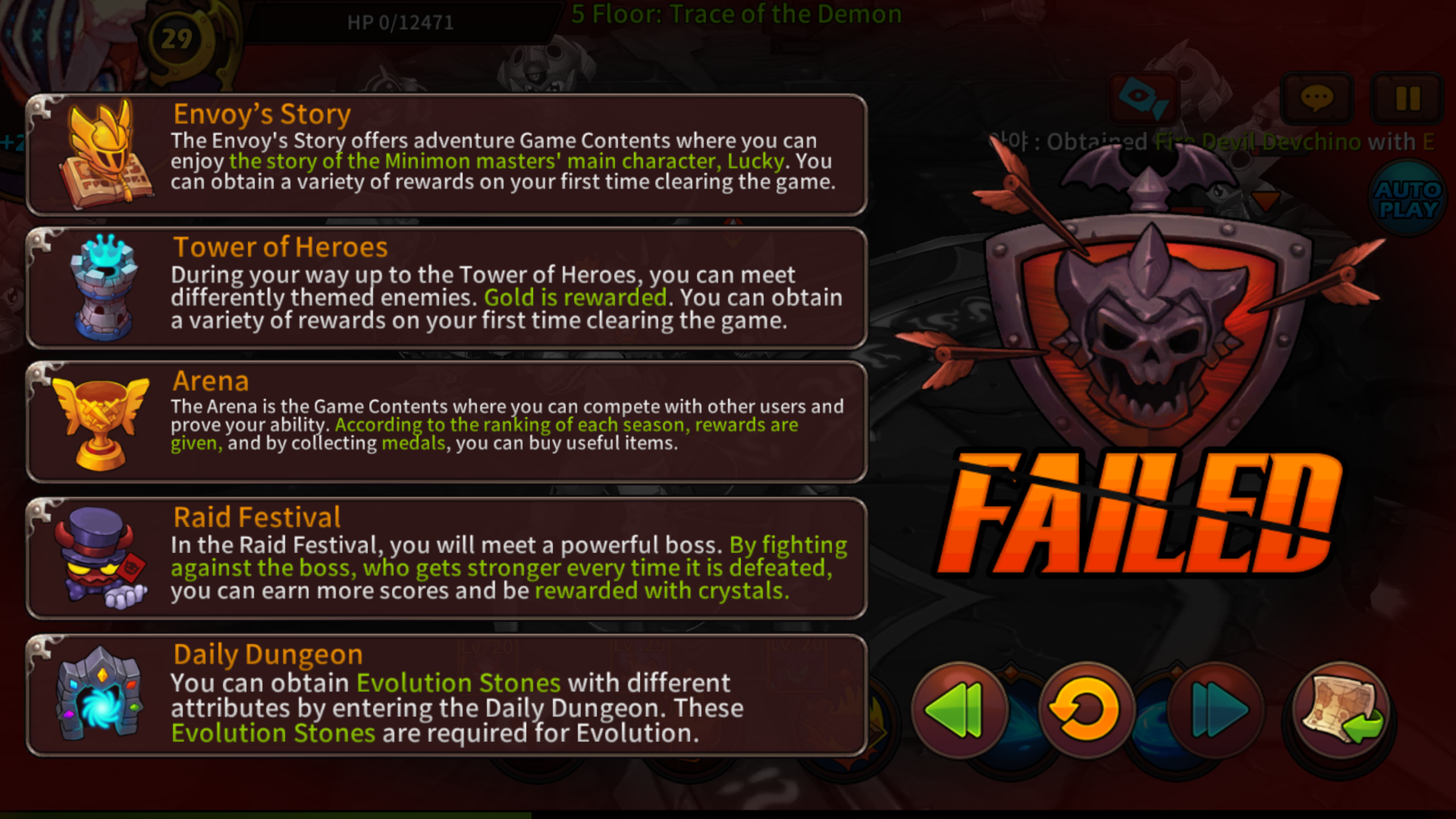 ภายในเกมเราจะตะลุยฉากไปเรื่อยๆโดยแบ่งออกเป็น  โซนต่างๆคล้ายๆเกมอื่นๆทั่วๆไป โดยเราสามารถเลือกฮีโร่และเพื่อนๆมินิม่อนไปได้ โดยแต่ละตัว(หาก 4 ดาวขึ้นไป)ก็จะมี Passive Skill ที่แตกต่างกันเพื่อช่วยเหลือเราในการต่อสู้ และมอนแต่ละตัวยังมีสกิลกด(active) ที่แตกต่างกันและใช้ในสถานการ์ณต่างๆด้วยโดยเฉพาะตัวฮีลนั้นจะมีค่ามากๆ