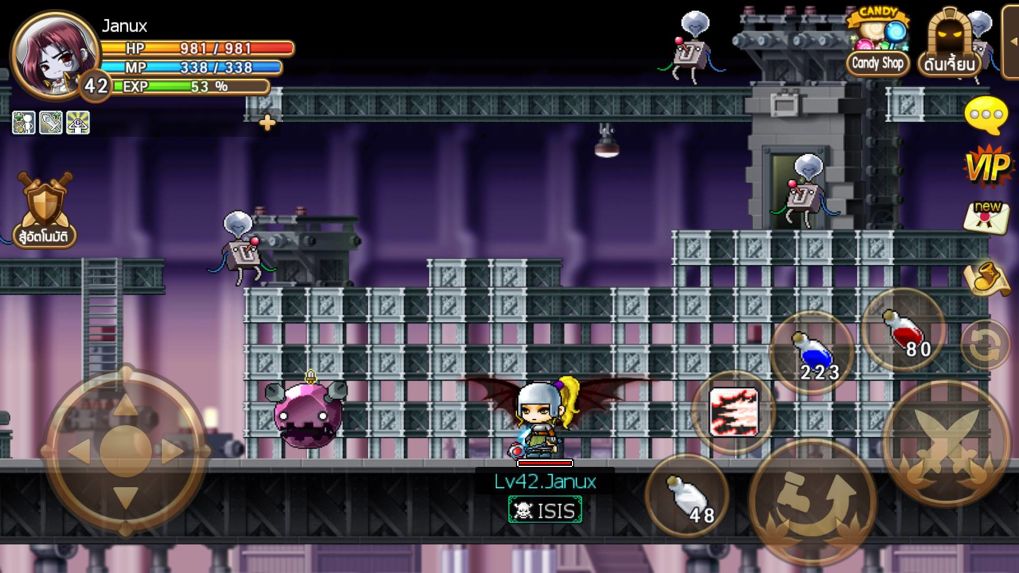 ระบบการต่อสู้ในเกมถอดแบบมาจากเกม Maple Story ในฉบับ PC เป๊ะๆ เพิ่มเติมด้วยระบบ Auto ที่สร้างความสะดวกสบายแก่ผู้เล่น แต่ Auto นั้นไม่ได้มีประสิทธิภาพมากซักเท่าไหร่ เพราะไม่สามารถกดสกิลและยาเองได้ จึงจำเป็นต้องปล่อย Auto ทิ้งไว้ในสถานที่ที่เหมาะสมกับระดับตัวละคร ปัญหา Auto ไม่สามารถกดยาเองได้นั้น แก้ไขได้ด้วยสัตว์เลี้ยง ซึ่งมีราคา 1000 แคนดี้ต่อ 30 วัน อยากสบายต้องลงทุนหน่อยนะจ๊ะ