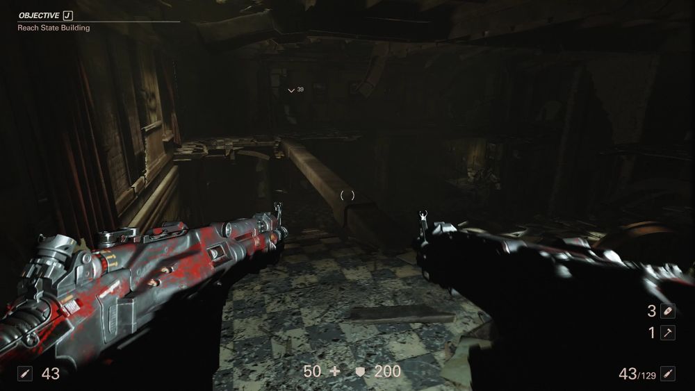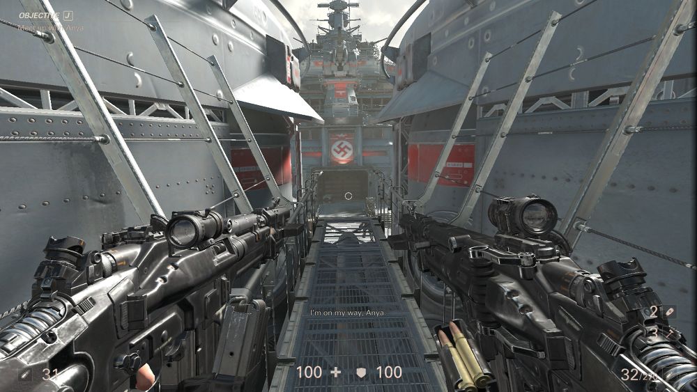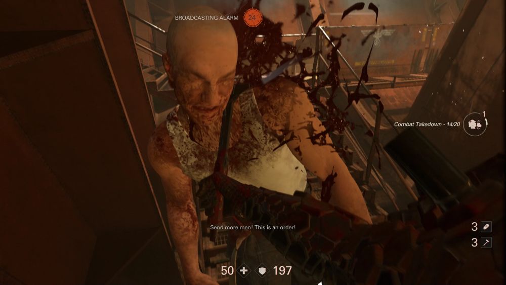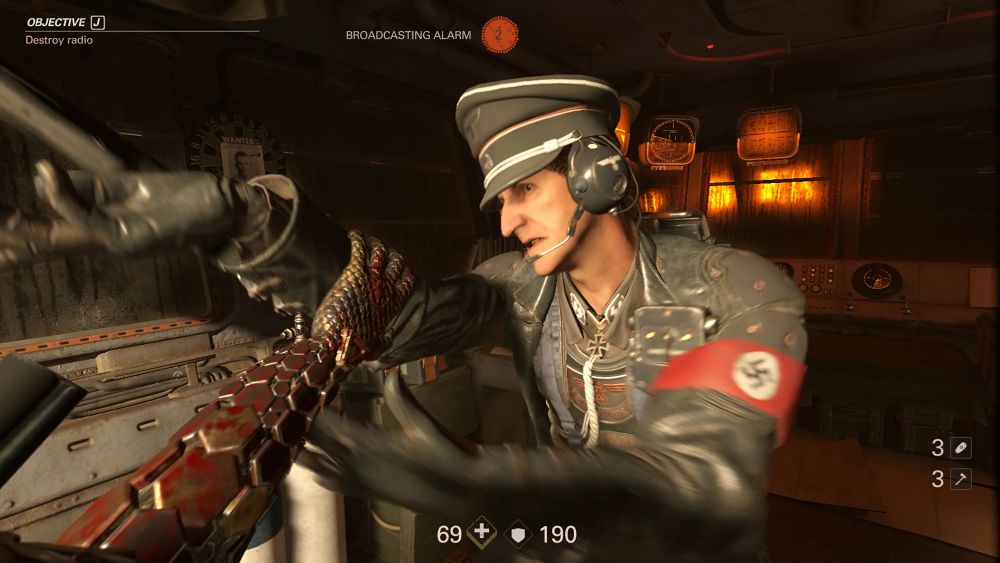 ใน Wolfenstein ภาคก่อนหน้า ส่วนมากระบบการต่อสู้จะเน้นการใช้ปืนคู่แบบ Dual เดินหน้าสาดกระสุนใส่ศัตรูอย่างเมามันส์เป็นจุดเด่นของเกม แต่พอมาภาคนี้ มีอีกสิ่งหนึ่งที่ผมชอบมากๆนั่นคือการต่อสู้แบบระยะประชิดที่เราสามารถใช้ Hatchet หรือขวานเล็ก เข้าจู่โจมระยะประชิดได้ หรือจะใช้ปาสังหารศัตรูระยะไกลก็ได้ ซึ่งบอกเลยว่าเจ้า Hatchet เนี่ยมันทำให้การต่อสู้ระยะประชิดนั้นดุเดือดและมันส์ขึ้นสุดๆ เพราะภาคนี้การ Stealh Kill จะมี Action การฆ่าที่โหด ดิบ เลือดสาด สาแก่ใจคนเสพความรุนแรงอย่างมาก ดังนั้นหลายครั้งเลยทีเดียวที่เรารู้สึกว่าใช้ปืนมันดิบไม่พอ เดินเข้าไปฟันมันนี่ละ มันส์สุดแล้ว!