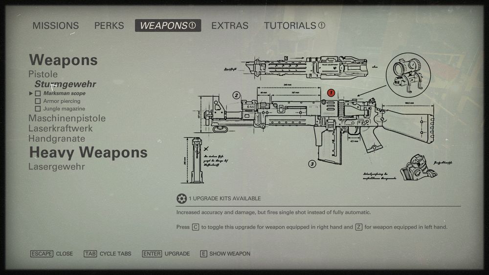 สิ่งหนึ่งที่พัฒนามาจากภาคที่แล้วอย่างเห็นได้ชัดเลยนั่นคือมีการเพิ่มระบบการอัพเกรดอาวุธเข้ามาแล้ว โดยอาวุธทุกอย่างของเรานั้นสามารถอัพเกรดได้แตกต่างกัน อย่างเช่นปืน Submachine Gun ก็สามารถอัพเกรดเพิ่มแม็กกาซีนกระสุนได้ หรืออัพเกรดให้กระสุนกลายเป็นตะปูเจาะเกราะได้ ซึ่งเงื่อนไขในการอัพเกรดนั้นเพียงเราหา Upgrade Kit ที่ซ่อนอยู่ตามฉากดีๆก็จะเอามาอัพเกรดอาวุธได้แล้ว ดังนั้นอย่ามัววิ่งไล่ยิงเพลินจนลืมหา Upgrade Kit ล่ะ บอกเลยว่าสำคัญมากเพราะมันจะทำให้เราต่อกรกับศัตรูระดับใหญ่หรือพวกบอสได้เลยทีเดียว
