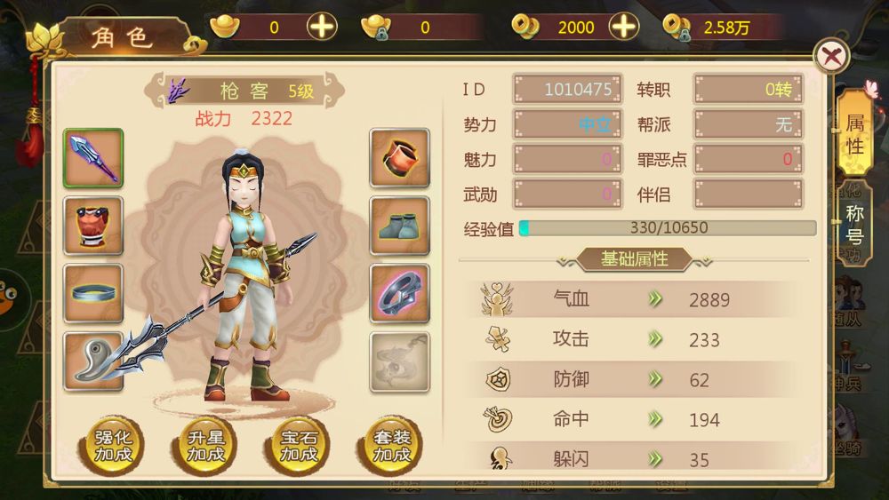 ตัวละครของผู้เล่นจะมีทั้งหมด 5 แบบ สายดาบ สายกระบี่ สายหอก สายธนู สายพัด เลือกได้ทั้งเพศชาย-หญิง โดยแต่ละสายจะมีเนื้อเรื่องแตกต่างกันเล็กน้อย นำเสนอจุดเด่นของตัวละครออกมาอย่างชัดเจน