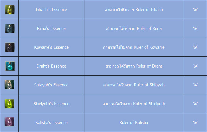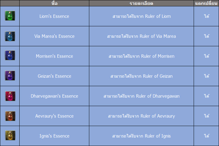 Essence’s Item คือสิ่งตอบแทนอันล้ำค่าที่ได้รับจากการพิชิต Ruler Monster ได้สำเร็จ ซึ่งจะมีทั้งหมด 14 ชนิด แบ่งไปตาม Ruler Monster ผู้เป็นเจ้าของ โดยมีรายละเอียดดังต่อไปนี้