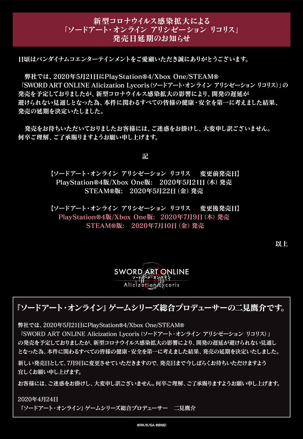 วันที่ 24 เมษายน 2020, ทีมงานผู้พัฒนาเกม SWORD ART ONLINE Alicization Lycoris จากค่าย BANDAI NAMCO ได้ออกประกาศอย่างเป็นทางการว่า 「เนื่องจากได้รับ ผลกระทบจากปัญหา COVID19 จีงมีความจำเป็นต้องเลื่อนกำหนดการวางจำหน่ายเกมออกไป จากเดิมในวันที่ 25 พฤษภาคม 2020 (เดือน 5) ไปเป็น 9 กรกฎาคม 2020 (เดือน 7) ทั้งในเวอร์ชั่น PlayStation4, XBOX One และ Steam」、นอกจากนี้ยังได้ปล่อย VDO แนะนำเนื้อหาของเกมตัวใหม่ออกมาให้ชมกันเพิ่มเติมอีกด้วย