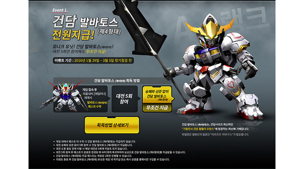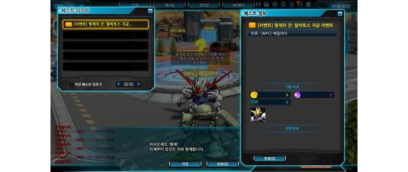 ฉลองการอัพเดท PVP Mode 8vs8 กับเควสรับหุ่นเหล็กจาก MS.Gundam ซี่รี่ย์ใหม่ล่าสุด "Barbatos" ง่ายๆ เพียงรับเควสกับ NPC "Aile Strike Gundam" เข้าเล่น "PVP Mode" ครบ 5รอบ เพื่อเครียร์เงื่อนไขเควส แล้วกลับมาส่งเควสรับรางวัลกันไปเลยง่ายง่าย!!!  ด่วนเควสนี้รับได้ในช่วงเวลากิจกรรมเท่านั้น