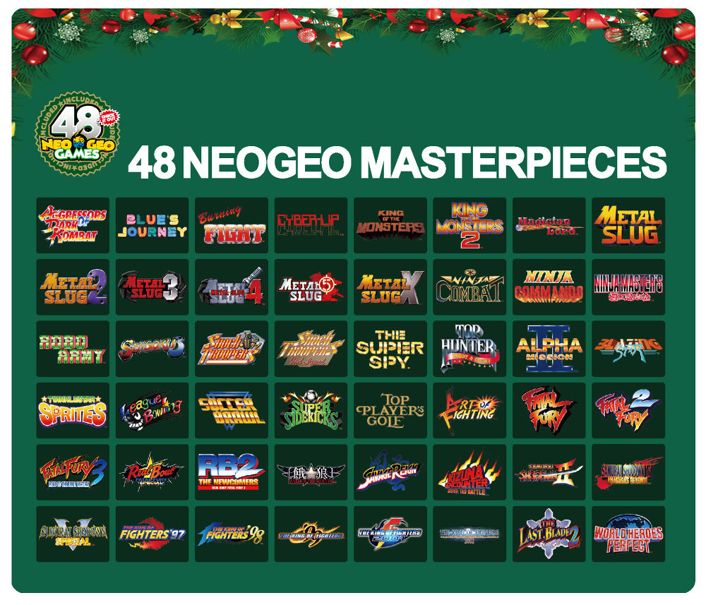 โดยเจ้าเครื่อง NEOGEO mini Christmas Limited Edition นี้ได้บรรจุหลายๆเกมที่อยู่ในความทรงจำของเพื่อนๆให้หวนนึกถึงวันเก่าอีกครั้ง รายชื่อเกมบรรจุอยู่มีดังนี้