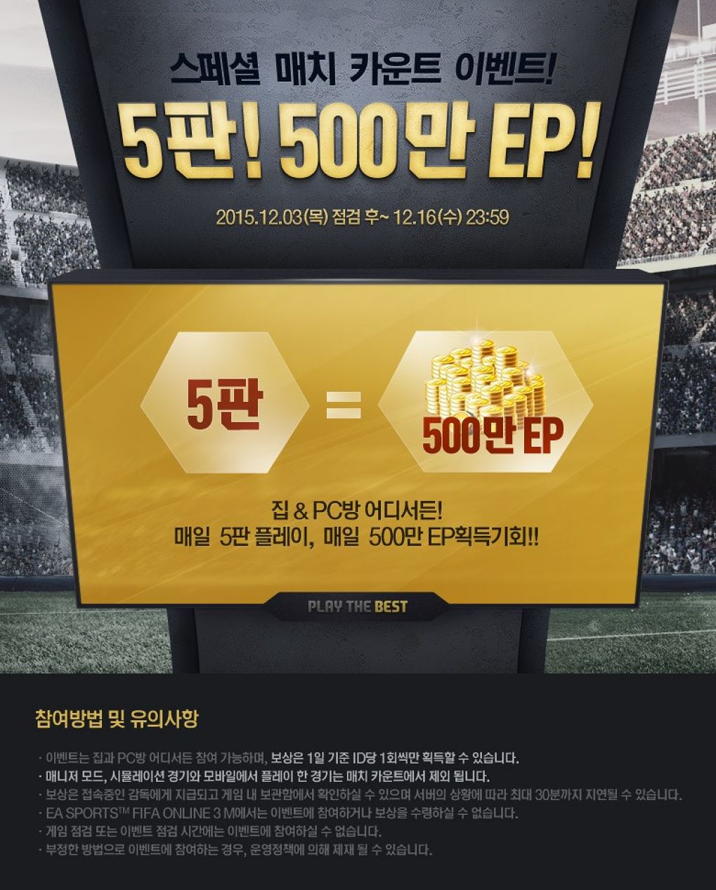 รายละเอียดกิจกรรม : ทุกๆครั้งที่เล่นครบ 5 แมตช์ โดยใช้เครื่อง PC ในบ้านหรือร้านอินเตอร์เน็ต จะได้รับทันที 500,000 EP โดยไม่มีข้อแม้!!