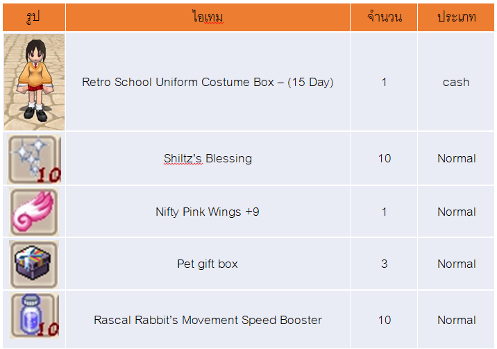 -ตัวละครแรกของแต่ละไอดีที่เข้าสู่เกมในเซิฟเวอร์ Rascal ครั้งแรก จะได้รับไอเทม