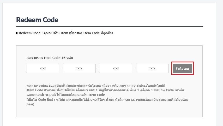 ขั้นตอนที่ 3 : กรอกรหัส Item Code ทั้งหมด 16 หลักให้ถูกต้อง แล้วกดปุ่ม “รับไอเทม”