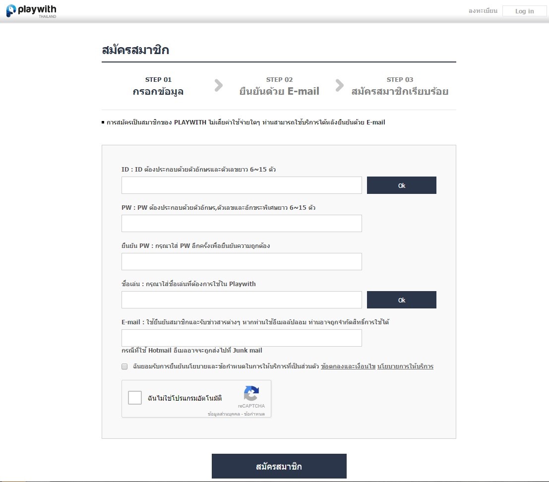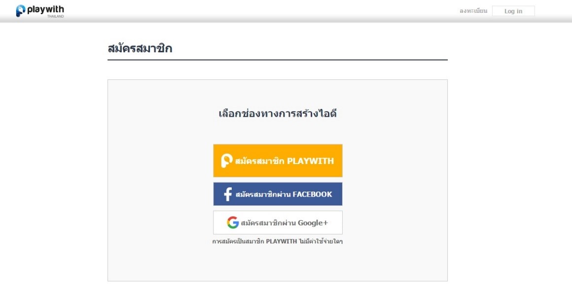 โดยเพื่อนๆสามารถเลือกลงทะเบียนผ่าน Facebook หรือ Google+ แต่ถ้าผู้เล่นอยากสร้างไอดีส่วนตัวที่ไม่เกี่ยวข้องกับโซเชียลต่างๆ ก็ยังสามารถสร้างด้วย Playwith ID ได้อีกด้วย