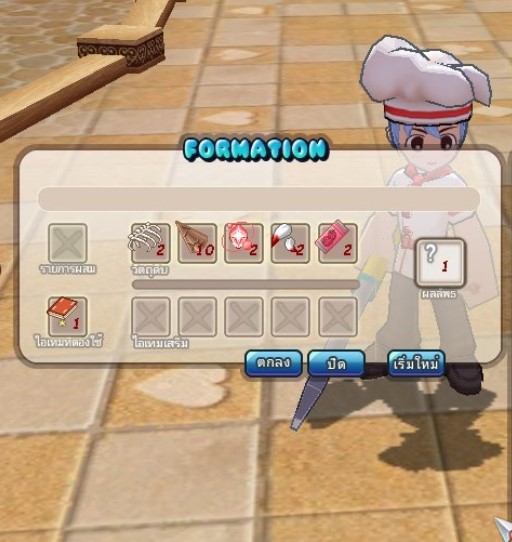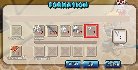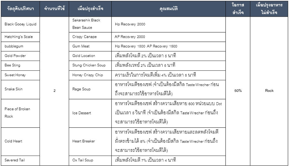 ส่วนไอเทมในช่องสุดท้าย ต้องใช้ไอเทมเหล่านี้ชนิดใดชนิดหนึ่งจำนวน 2 ชิ้น ซึ่งไอเทมที่เลือกใช้ ก็จะแสดงผลออกมาเป็นอาหารต่างกันไป นอกจากนี้ยังมีโอกาสปรุงสำเร็จ 50% และหากไม่สำเร็จ เราก็จะได้หินเปล่าๆมาแทนจ้า