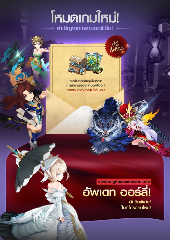 สำหรับโหมด “คำเชิญจากเหล่ายอดฝีมือ” นั้นจะเป็นดันเจี้ยนพิเศษที่มีอัศวินยอดฝีมือจากชาติต่างๆ คือ ไทย (พยัคฆ์เมฆา) ไต้หวัน (มิโฮะ) อเมริกา (เอมิเลีย) และอินโดนีเซีย (โรโร) ผู้ที่สามารถโค่นยอดฝีมือเหล่านี้ลงได้จะได้รับเหรียญที่สามารถนำไปแลกอัศวินลับได้ถึง 8 คน แลกเครื่องประดับ “แหวนแห่งความมุ่งมั่นระดับสูง” หรือรางวัลอื่นๆ ได้อีกมากมาย