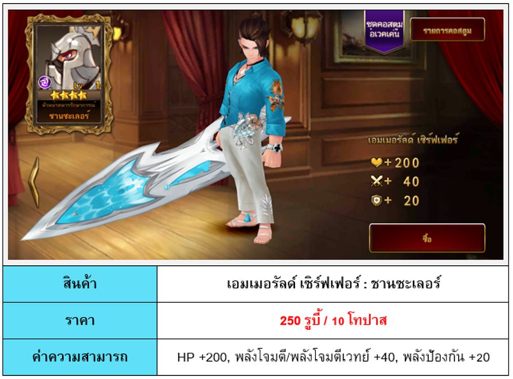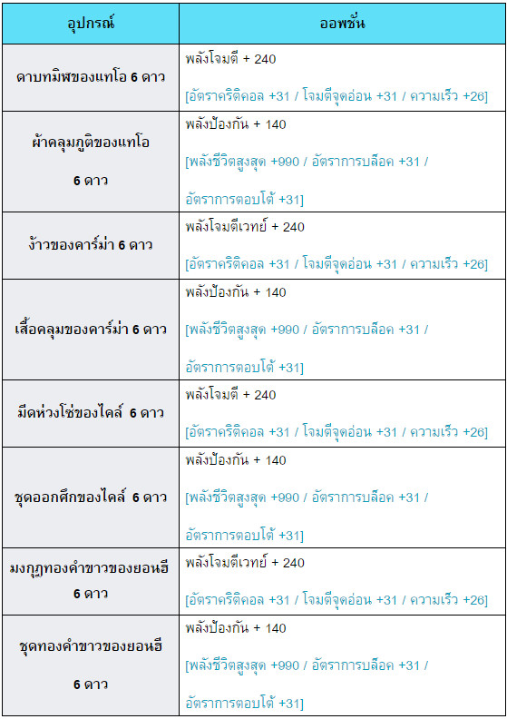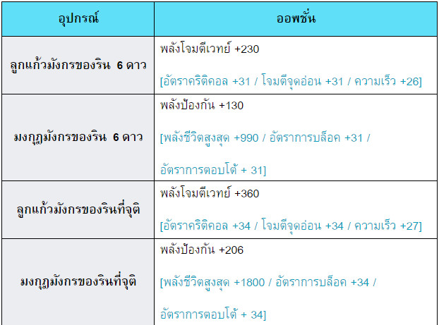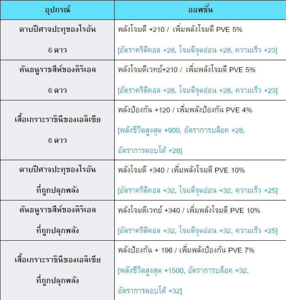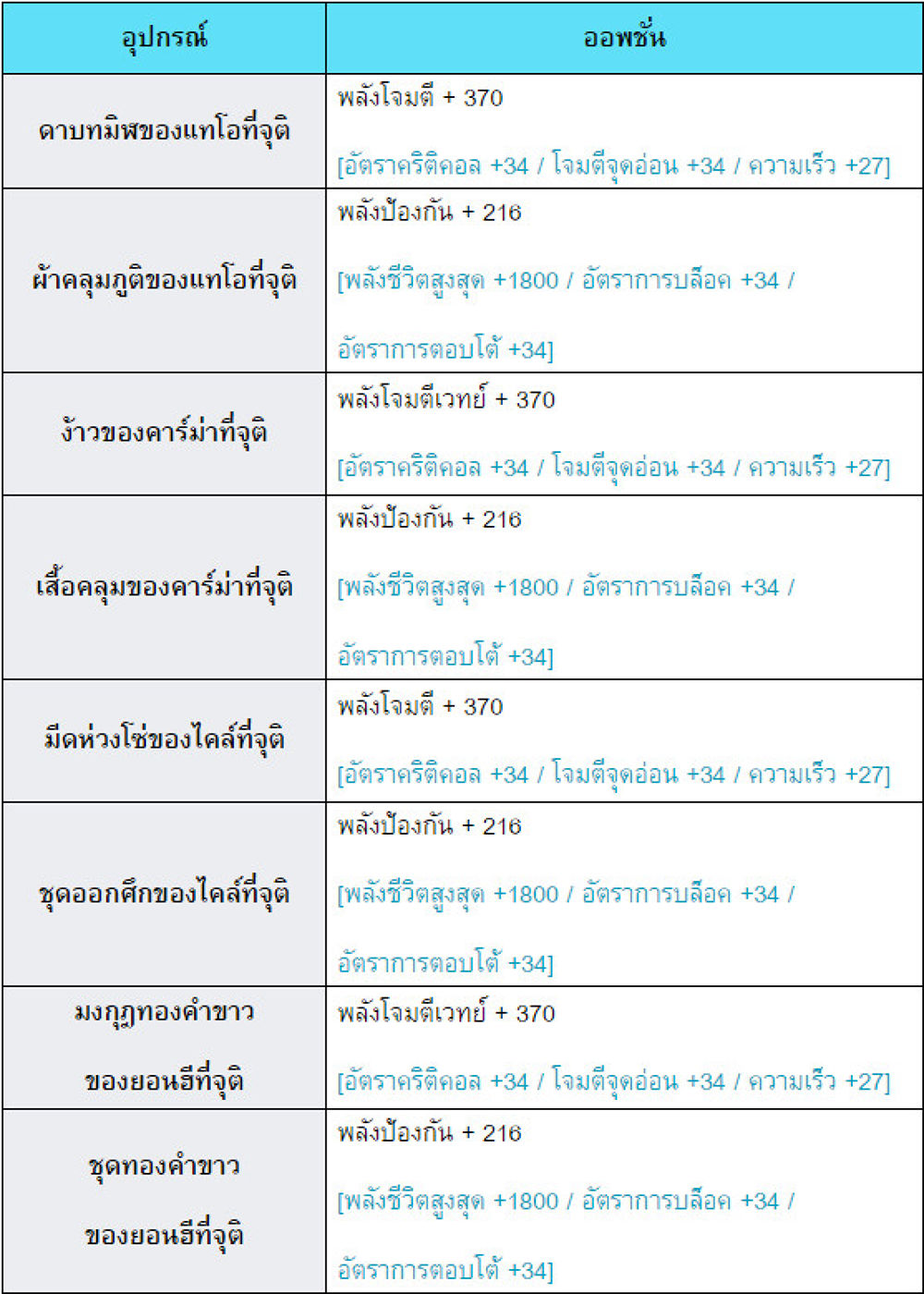 - ค่าพลังโจมตี/พลังโจมตีเวทย์/พลังป้องกันจะสูงกว่าอุปกรณ์สี่จักรพรรดิ