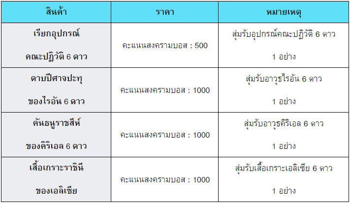 อุปกรณ์คณะปฏิวัติสามารถซื้อในร้านค้าสงครามบอสได้ด้วยคะแนนสงครามบอส