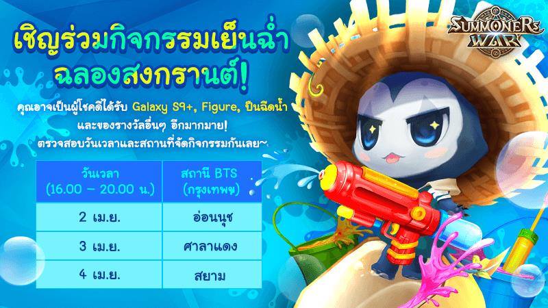 Summoners War จัดงานต้อนรับเทศกาลสงกรานต์ตั้งแต่วันที่ 2 - 4 เม.ย. แจกปืนฉีดน้ำสีสันสดใสสำหรับผู้เล่นทุกคนที่เข้าร่วมกิจกรรมนี้ไปเลยฟรี ๆ งานนี้อาจจะต้องรีบหน่อย เพราะปืนฉีดน้ำมีจำนวนจำกัด แต่ไม่ต้องกังวลไปเพราะสถานที่ที่จัดกิจกรรมนั้นเดินทางแสนจะง่ายและสะดวกตลอดระยะเวลากิจกรรมทั้ง 3 วัน โดยกิจกรรมในวันแรกจัดขึ้นที่ BTS อ่อนนุช ใครที่พลาดไปก็ไม่ต้องเสียใจ มาพบกันได้ที่ BTS ศาลาแดง (3 เม.ย) และ BTS สยาม (4 เม.ย) ตั้งแต่ 16:00 - 20:00 น. งานนี้ไม่ว่าใครก็มีส่วนร่วมได้ทุกคน เพราะฉะนั้นจะรออะไรอยู่ล่ะ! มีเพื่อนชวนเพื่อน มีแฟนชวนแฟน ไปรับปืนฉีดน้ำฟรีเตรียมพร้อมสำหรับสงกรานต์ร้อนระอุนี้กันดีกว่า