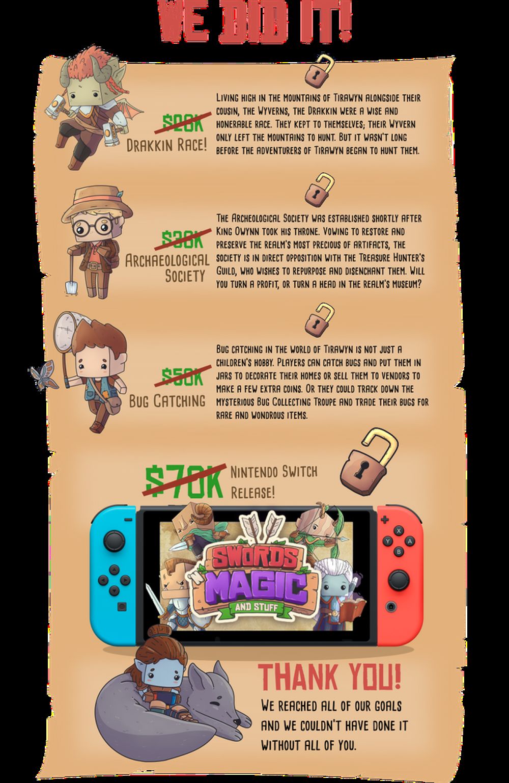 ส่วนการที่เกมดังกล่าวได้เตรียมจะนำไปลงบนเครื่อง Nintendo Switch นั้นก็เป็นเพราะพวกเขาได้วางแผนไว้เมื่อมีเงินระดมทุนครบ 2.2 ล้านบาทนั่นเอง ซึ่งก็ถือว่าเกม Swords 'N Magic And Stuff นั้นสมควรแล้วที่จะได้รับเงินระดมทุนมากถึง 2.5 ล้านบาท หากใครสงสัยว่าเพราะอะไร และเกมมันน่าเล่นมากขนาดนั้นจริงๆ หรือ ก็สามารถเข้าไปหาคำตอบจากที่ Playultimate เคยเขียนเอาไว้ได้ที่นี่