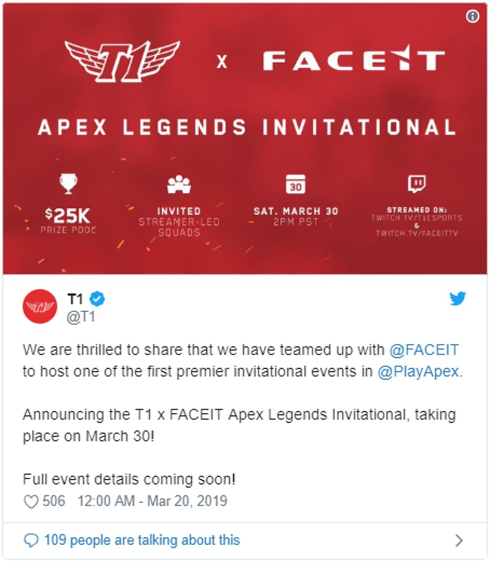 สำหรับการแข่งขันครั้งนี้จะใช้ชื่อว่า T1 x FACEIT Apex Legends Invitational เป็นการร่วมมือกันระหว่าง T1 และ FACEIT มีกำหนดการแข่งขันในวันที่ 30 มีนาคม 2019 โดยผู้เข้าร่วมแข่งขันในครั้งนี้จะเป็นทีมเชิญทั้งหมด ซึ่งจะคัดเลือกมาจากนักแข่งขันมืออาชีพรวมกันกับเหล่าคนดัง Streamers นั่นเอง