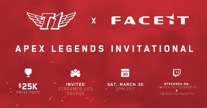 T1 Entertainment & Sports บริษัทร่วมทุนด้าน Esport ที่สร้างขึ้นภายใต้ SK Telecom และ Comcast Spectacor ได้ประกาศร่วมมือกันกับ FACEIT เพื่อจัดการแข่งขัน Apex Legends Invitational ปลายเดือนนี้ ด้วยเงินรางวัลรวมมูลค่ากว่า $25,000 ซึ่งจะมีการสตรีมสดในช่อง T1 และ FACEIT Twitch ชมกันทั่วโลก