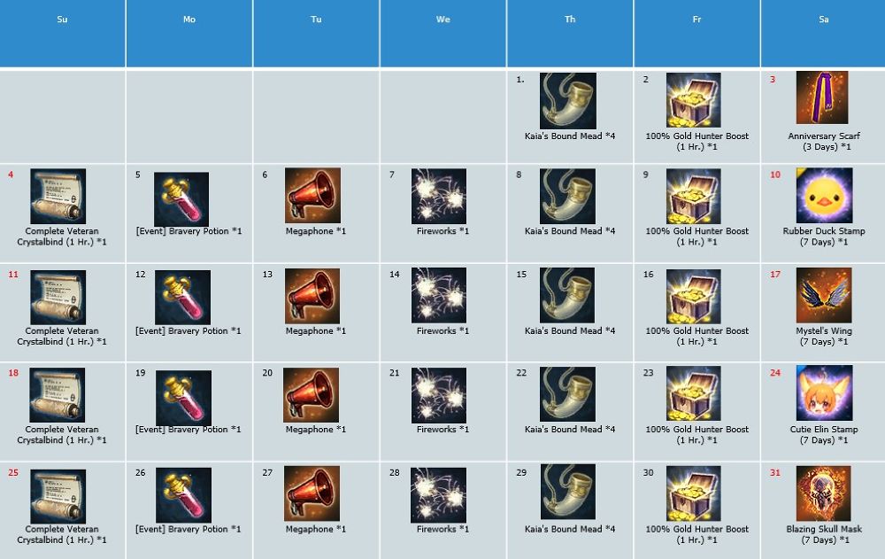 ► กิจกรรมแรก รับไอเทมกันแบบง่ายๆ เพียงแค่ล็อกอินเข้าเกมในแต่ละวัน ก็จะได้รับไอเทมประจำวันนั้นไปเลย ยิ่งเข้าเล่นทุกวันก็ยิ่งได้ไอเทมทั้งหมดตามตารางด้านล่างเลยนะ!