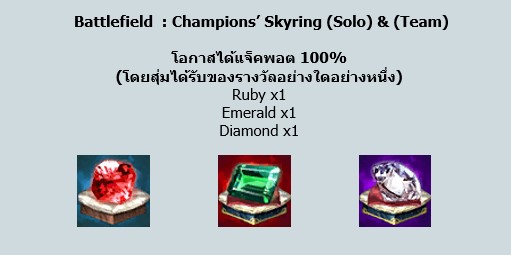 ► กิจกรรมสุดฮอตสำหรับขา Battlefield เพียงเข้าร่วม Battlefield : Champion’s Skyring แบบเดี่ยว หรือ ว่า แบบทีม เมื่อผู้เล่นสามารถคว้าชัยชนะมาได้ก็จะได้รับรางวัลแจ็คพอตไปเต็มๆ ต้องบอกว่าถ้าพลาดนี่เสียดายแย่จริงๆ! สำหรับของรางวัลก็ตามภาพด้านล่างเลยนะ!