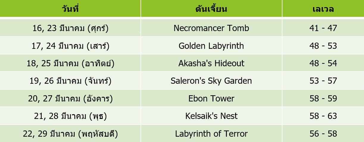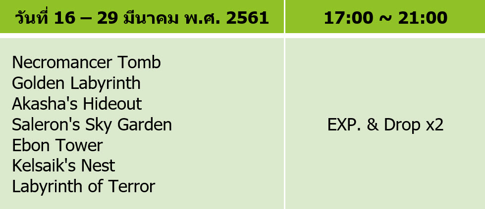 ► 1. ช่วงเวลาสุดมันส์ x2 Exp. และ Drop ไอเทม ในทุกๆ ดันเจี้ยนตามที่กำหนดในตารางเอาไว้
