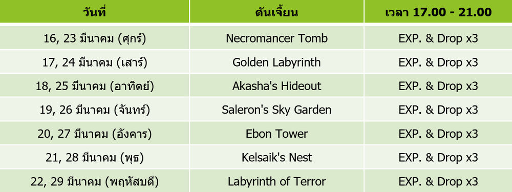 ► 2. ช่วงเวลาสุดเทพ!! x3 Exp. และ Drop ไอเทม ในดันเจี้ยนที่ระบุเอาไว้ในตารางที่กำหนด