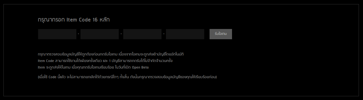 ขั้นตอนที่ 3 : กรอกรหัส Serial Code ทั้งหมด 16 หลักให้ถูกต้อง แล้วกดปุ่ม “รับไอเทม”