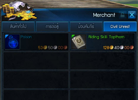 - ผู้เล่นไม่สามารถใช้สัตว์ขี่ทั่วไปได้ โดยจะต้องใช้เป็นพาหนะพิเศษ อย่าง ม้าดำ [Topthorn] มีขายที่ [NPC: Merchant] บริเวณจุดเริ่มต้น (ท่าเรือ) ของแผนที่ Civil Unrest โดยความเร็ว 270 นอกจากนั้น ยังมีไอเทมแล้วก็ Poison (ยาพิษ) เมื่อใช้แล้วจะฆ่าตัวละครของเราทันที