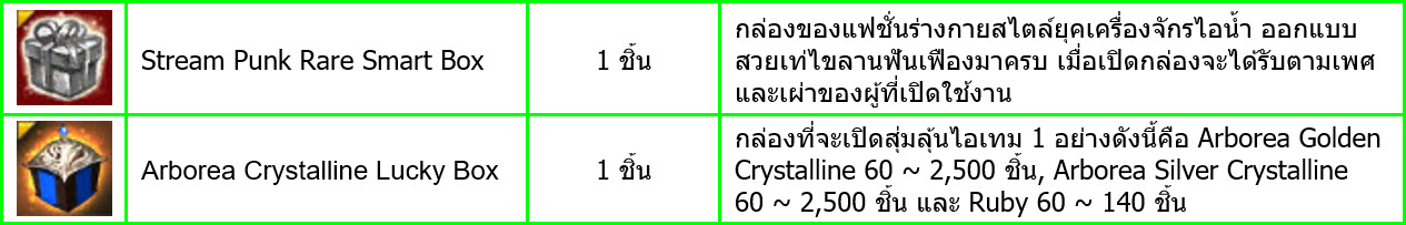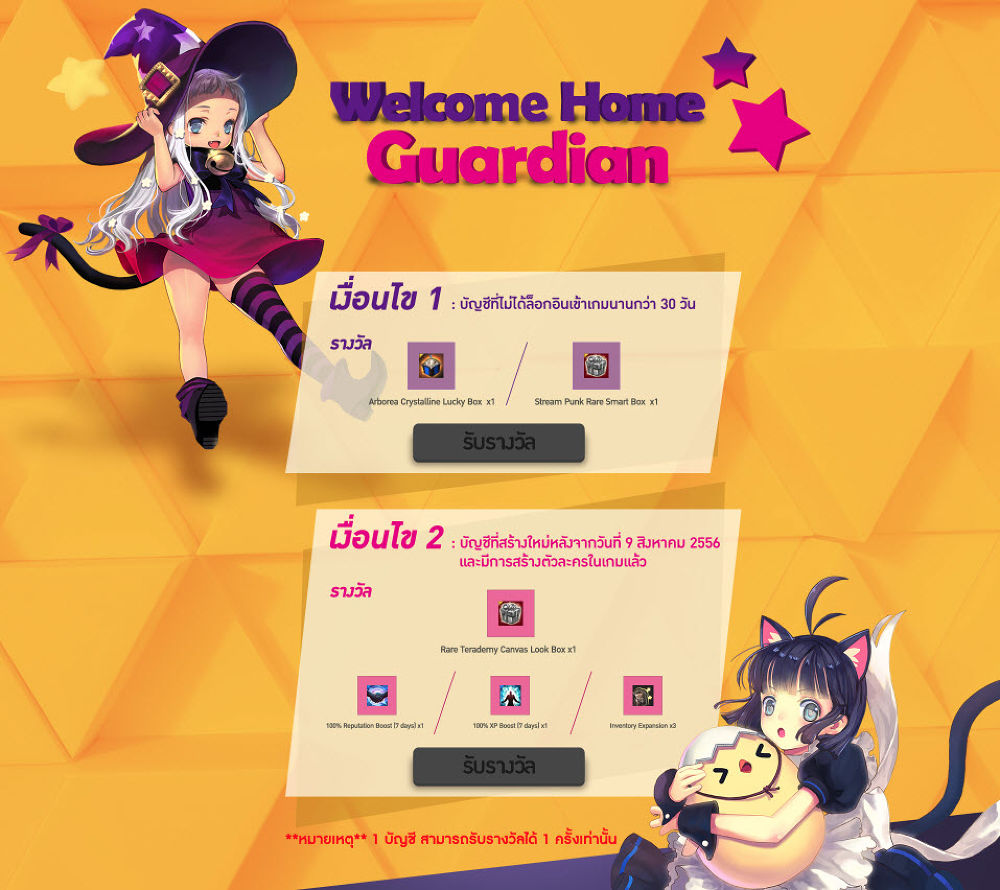 • ผู้เล่นบัญชีเก่า เงื่อนไขคือจะต้องไม่ล็อกอินเข้าเกมเลยเกิน 30 วันขึ้นไป!! นับย้อนหลังตั้งแต่วันที่ 9 สิงหาคม ปีนี้ (**คำเตือน** ควรรับรางวัลให้เสร็จเสียก่อน ห้ามล็อกอินเข้าเกมเด็ดขาดเพราะจะเสียสิทธิ์)