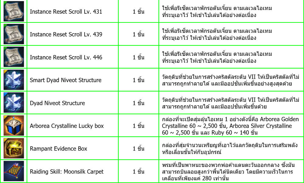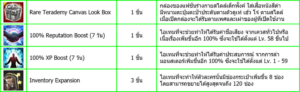 ตารางไอเทมรางวัลของผู้เล่นบัญชีใหม่ (ได้รับทั้งหมด)