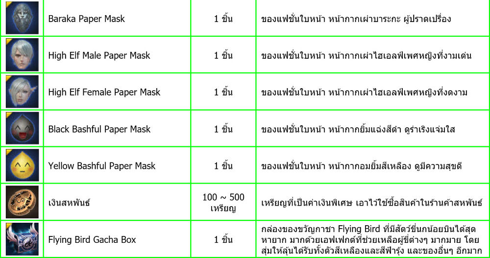 ตารางไอเทมรางวัลกาชาปอง (สุ่มได้รับ 1 อย่าง)