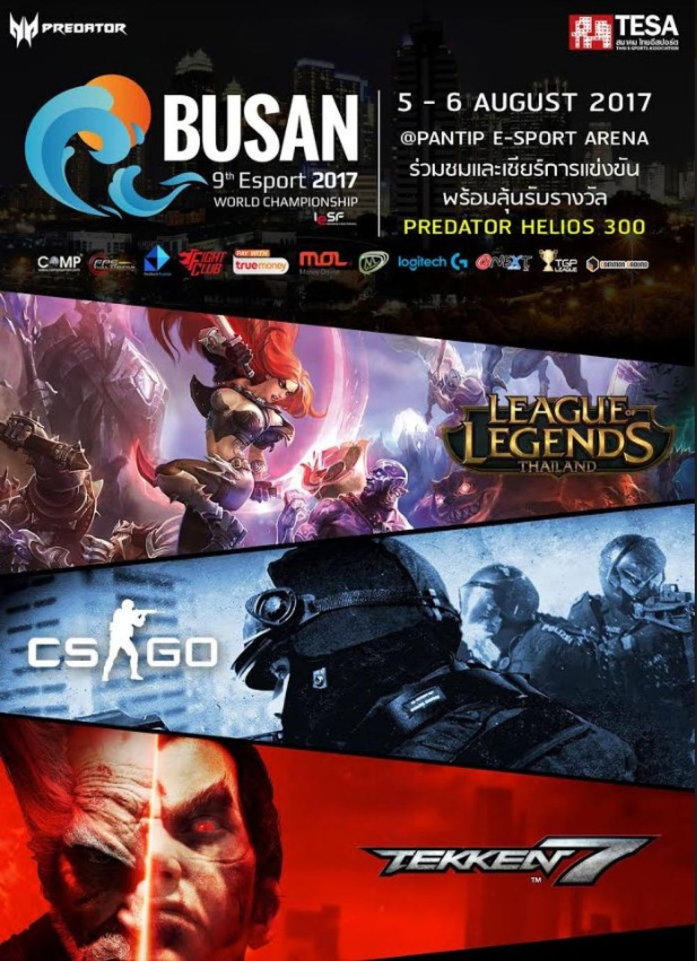 สมาคมไทยอีสปอร์ต (TESA) ร่วมกับ Acer Thailand จัดการแข่งขันคัดเลือกนักกีฬาอีสปอร์ตตัวแทนประเทศไทยเพื่อส่งเข้าแข่งขันรายการ BUSAN 9th E-Sport 2017 World Championship ที่เมืองปูซาน ประเทศเกาหลีใต้ ซึ่งจัดขึ้นโดยสมาพันธ์อีสปอร์ตโลก (IeSF) ในช่วงเดือนพฤศจิกายนที่จะถึงนี้ โดยในปีนี้ทางผู้จัดได้แบ่งการแข่งขันออกเป็น 3 ประเภทคือ