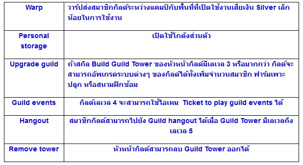 - เมื่อกิลด์มีเลเวล 4จึงจะสามารถใช้ฟังก์ชั่นกิลจกรรมกิลด์ที่ Guild Tower ได้