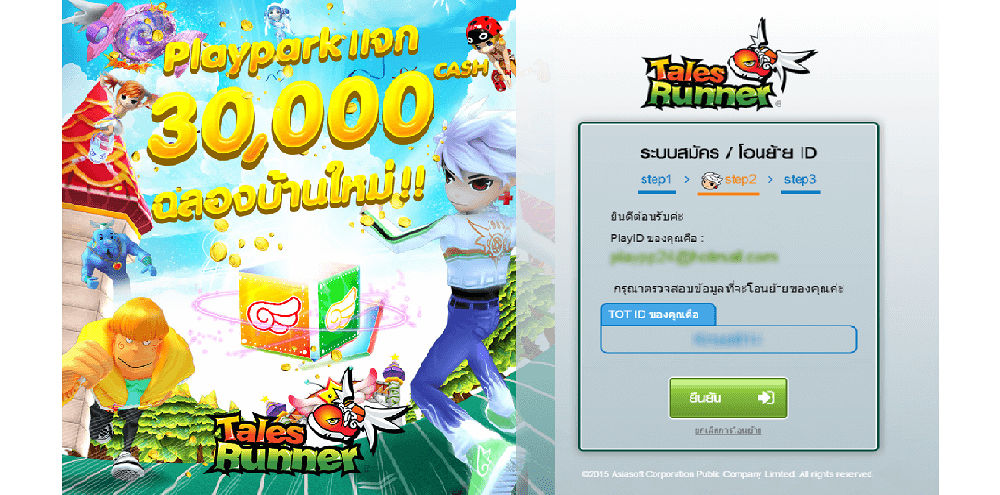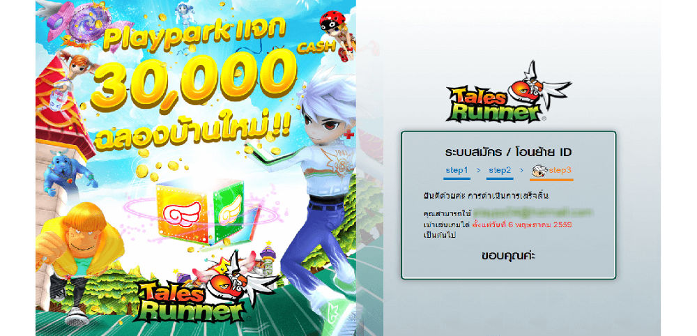 ที่จะใช้เข้าเล่นเกม Tales Runner (ข้อมูลตัวละครจะถูกโอนย้ายเข้าสู่ ID ที่ล็อคอิน) หากยังไม่มี Play ID สามารถสมัครฟรี โดยคลิกที่ปุ่ม