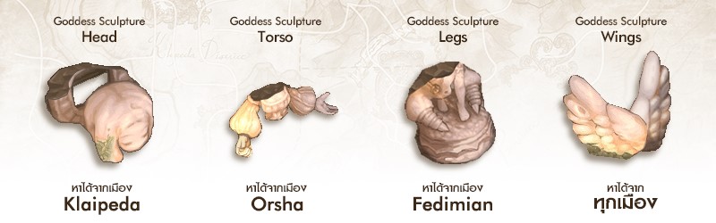 . ทำการรวบรวมชิ้นส่วนทั้ง 4 ส่วนจากนั้นทำการพูดคุยกับ Event Notice Board เพื่อทำการสร้างรูปปั้นของเทพธิดา.