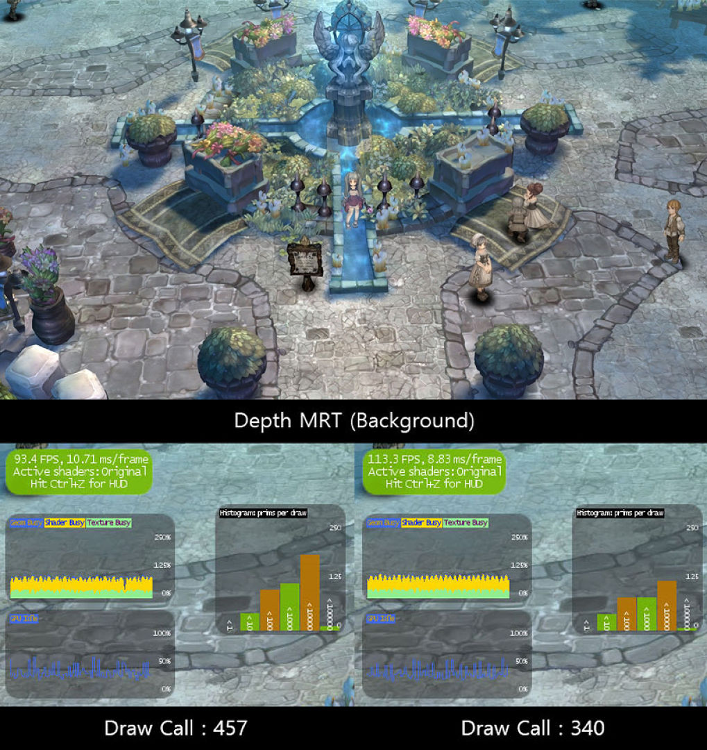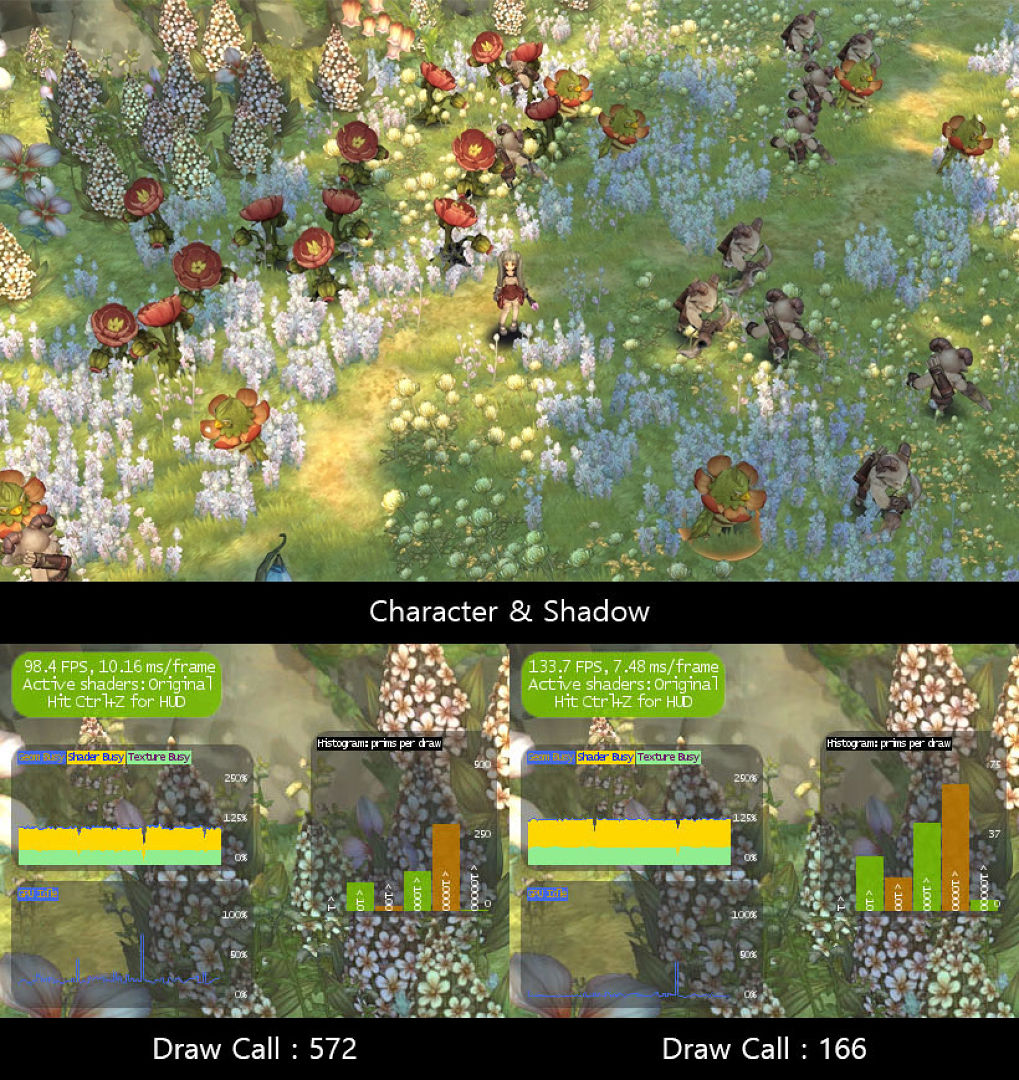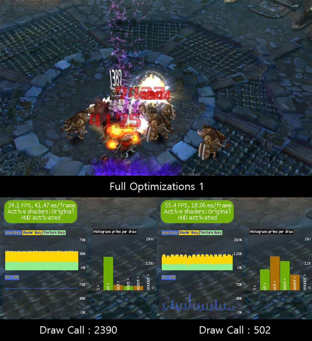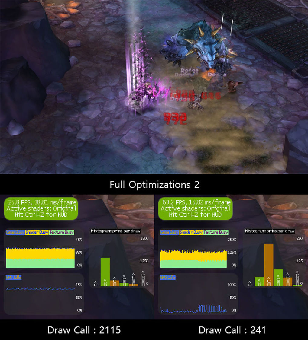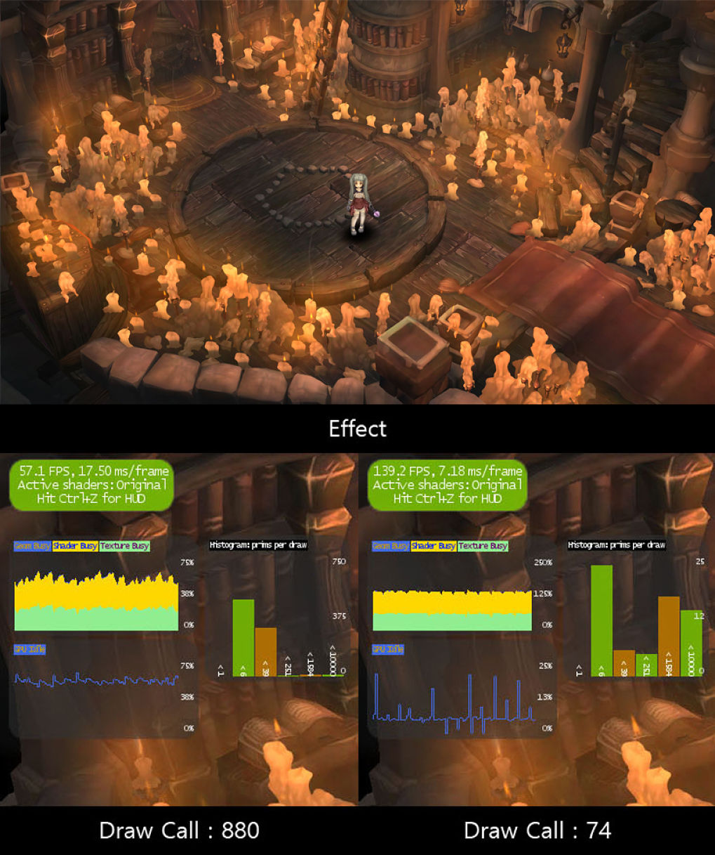 การทดสอบด้าน Effect ด้านซ้ายคือ Client ที่ยังไม่ Optimize Draw Call = 880 ส่วนด้านขวาจะเป็นฝั่งที่ Optimize แล้ว Draw Call เหลือเพียง 74 เท่านั้น ค่า FPS เพิ่มขึ้นเป็น139.2 เลย