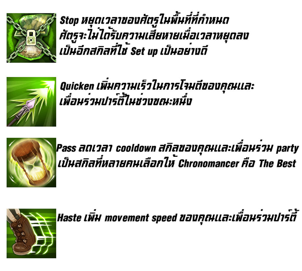 โดย dps นั้นมีพลังโจมตีที่สูงและเป็นวงกว้าง ส่วน support จะขาด Build Chronomancer ไม่ได้เนื่องจากสกิลนั้นมีประโยชน์