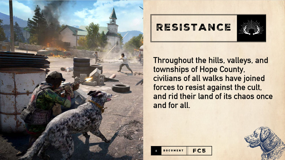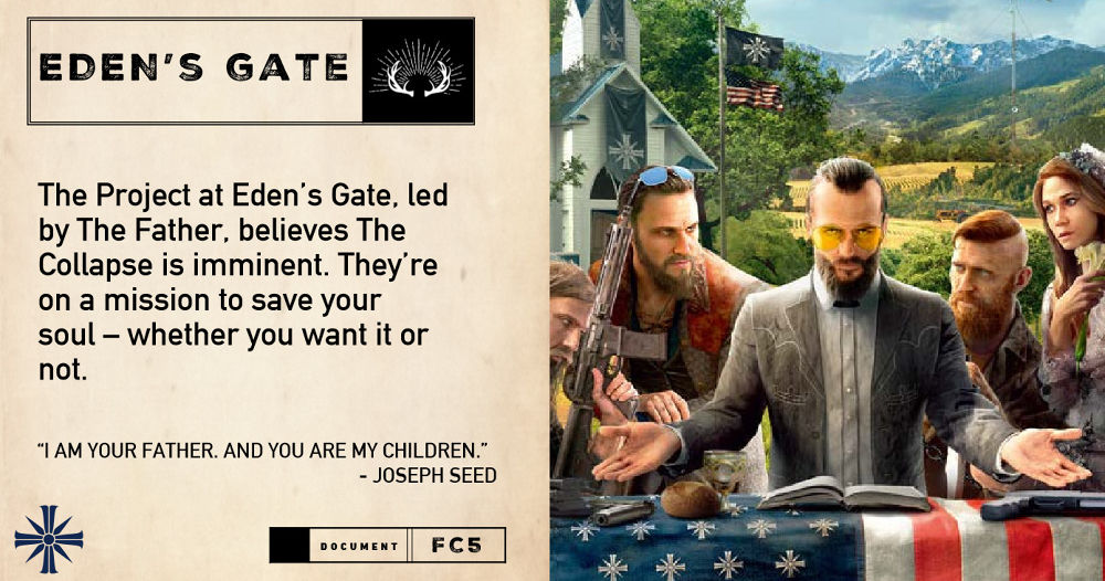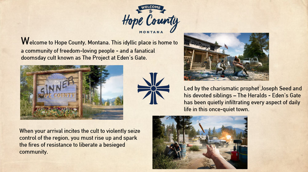 และเหล่าสาวกของเขากับกลุ่ม The Heralds - Eden's Gate เข้าไปแทรกซึมในชีวิตประจำวันทุกๆด้านของชาวเมืองในเมืองนี้ การมาถึงของผู้เล่นได้มาปลุกกระแสการลุกฮือของกลุ่มลัทธิความรุนแรงนี้เพื่อเข้ายึดพื้นที่ ภารกิจหลักของผู้เล่นคือการปลุกระดมกลุ่มคนให้ลุกขึ้นมาต่อต้านและปลดแอกชุมชนนี้