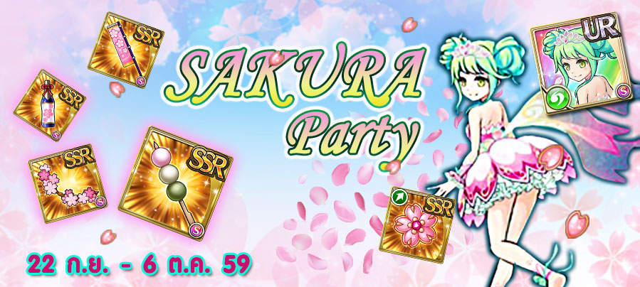 เริ่มกิจกรรม : 22 กันยายน 2016 เวลา 00.01 น.จบกิจกรรม : 6 ตุลาคม 2016 เวลา 09.29 น.1. ผู้เล่นมีโอกาสสุ่มได้รับ Monster Gear Misaki Wild ในระดับ SSR จาก ดันเจี้ยน Sakura Party ซึ่งสามารถพัฒนาได้จนถึงระดับ UR2. ดันเจี้ยน Sakura Party จะแบ่งตามความยากง่ายตาม Rank ให้เลือกเล่น โดยยิ่งเล่นแบบ Rank สูงมากเท่าไหร่ ยิ่งเพิ่มอัตราเปอร์เซ็นต์ในการดรอปมากยิ่งขึ้น3. วิธีการเข้าเล่นดันเจี้ยน ให้กดไปที่หน้า Quest และเลือกแถบ Event จากนั้นเลือกดันเจี้ยน Sakura Party