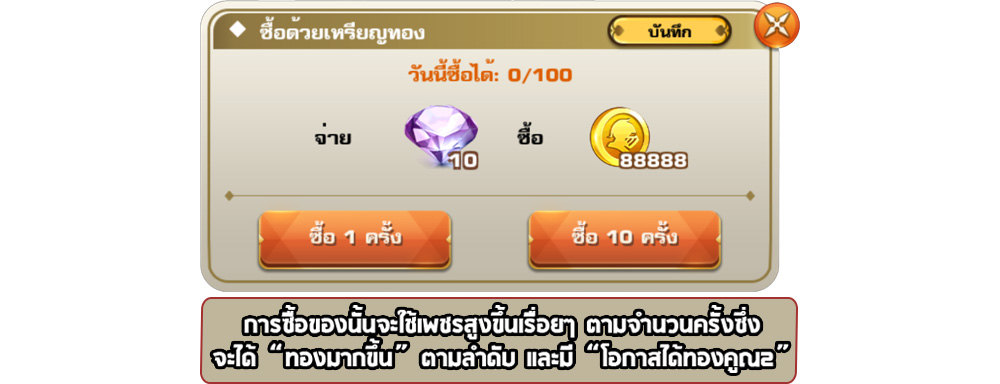 : คุณสามารถจ่ายเพชรซื้อเหรียญทองได้ โดยในแลกนั้นจำนวนเพชรที่ใช้ และทองที่ได้จะสูงขึ้นเรื่อยๆ ซึ่งหากคุณโชคดี มีสิทธิได้รับมากขึ้นเป็นสองเท่าอีกด้วย