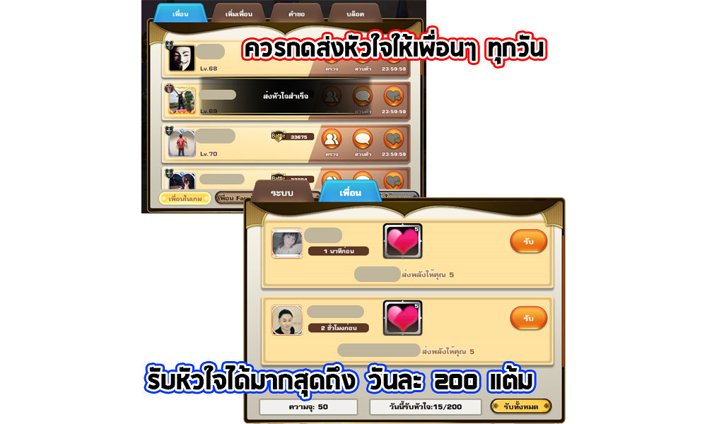 : ระบบเพื่อนของเกมนี้ มีประโยชน์ต่อการเล่นเป็นอย่างมาก เพราะหากคุณมีเพื่อนเยอะ คุณจะมีโอกาสได้รับพลังงาน (หัวใจ) จากระบบแลกเพชรมากขึ้นเท่านั้น *คุณสามารถรับหัวใจได้มากสุดถึง 200แต้มต่อวันที่ระดับ VIP11 ขึ้นไป