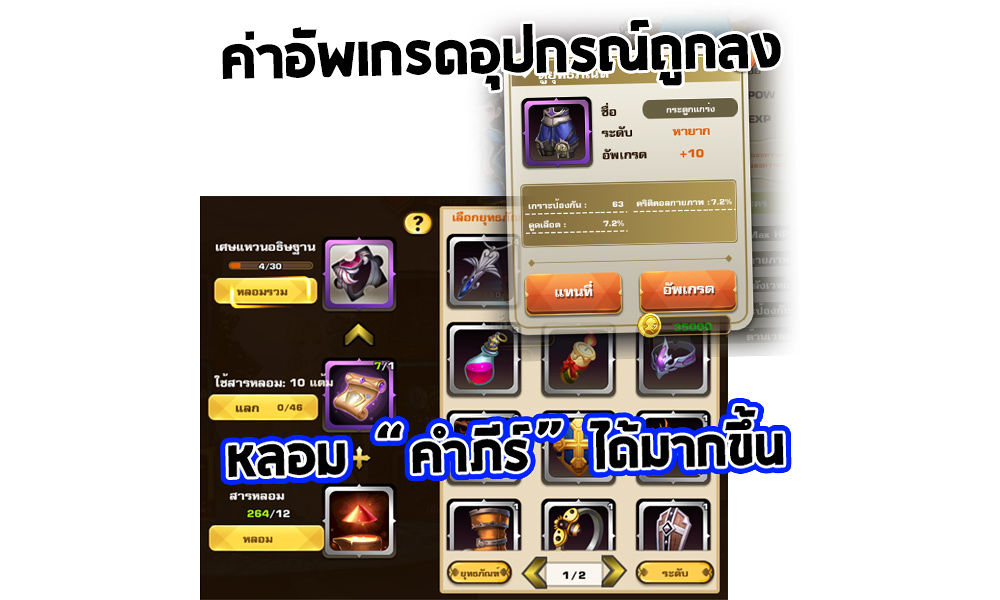 ค่าอัพเกรดยุทธภัณฑ์ (อุปกรณ์) ลดลง , สามารถแลกหลอมม้วนคัมภีร์สีต่างๆ ได้มากยิ่งขึ้น