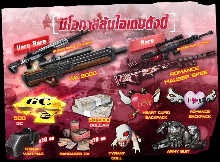 ต้อนรับเดือนแห่งความรักกับการแจกไอเทมแบบจัดเต็ม คลังแสงแตก ขอเชิญชวนเหล่าผู้รอดชีวิตเข้าร่วมสนุกกับกิจกรรม [Daily Login] Valentine's Sweet Heart เพียงออนไลน์เข้าเล่นเกมให้ครบ 1 ชั่วโมงในทุกๆวันเท่านั้น! รับไอเทมไปใช้ได้เลยกันแบบฟรีๆ ตั้งแต่วันที่ 1 ก.พ.61 (เวลา 12.00 น.) - 28 ก.พ. 61 (เวลา 23.59 น.) เล่นเกมแล้วยังได้รับไอเทม บอกเลยว่าคุ้มมาก ณ.จุดนี้ รออะไรล่ะ เข้าเกมเลย!