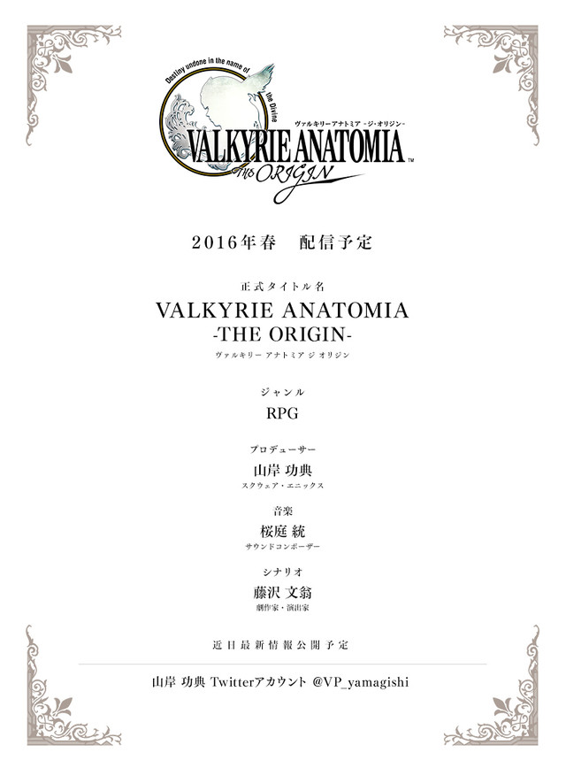 ข่าวดีสำหรับแฟนๆซีรี่ย์ Valkyrie มาแล้วจ้า เพราะในตอนนี้ทางค่าย Square Enix ค่ายเจ้าของลิขสิทธิ์ซีรี่ย์ Valkyrie Profile ได้เปิดเว็บไซต์เกม Valkyrie Anatomia: The Origin ออกมาให้ชื่นใจกันแล้ว โดยกำหนดการคร่าวๆคือจะวางจำหน่ายในช่วงฤดูใบไม้ผลิ ( ประมาณมีนาคมถึงมิถุนายน ) แต่กระนั้นก็ยังไม่ได้เปิดเผยว่าตัวเกมจะมีอะไรบ้าง แต่ว่าอันกับแรกที่เปิดเผยมาคือคุณ Yoshinori Yamagishi โปรดิวเซอร์คู่บุญจะได้กลับมาทำหน้าที่เดิมพร้อมกับเปิดช่องทาง Twitter ไว้คอยอัพเดทข่าวสารเกมให้ทราบกันเรื่อยๆด้วยนะ